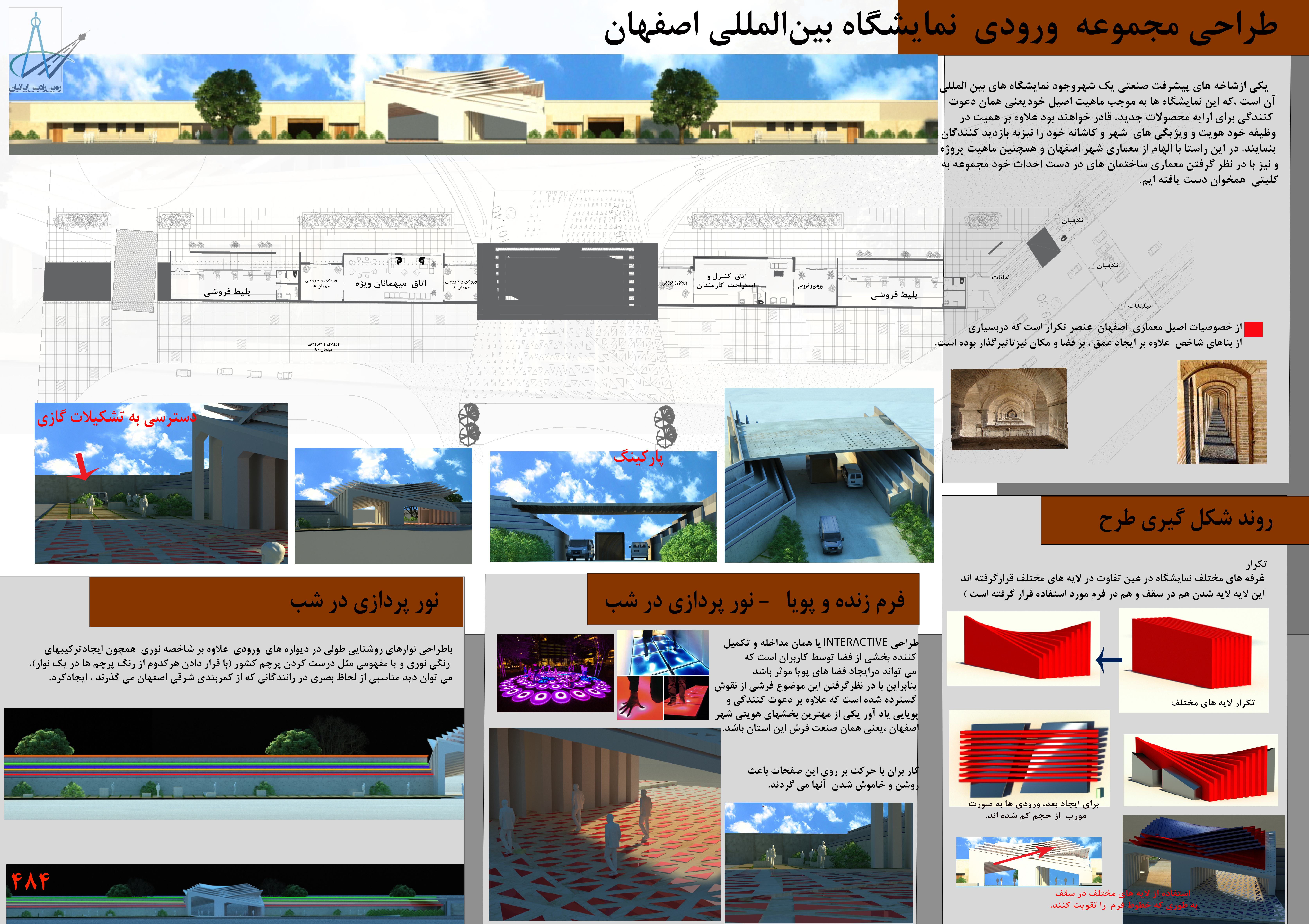 مکان: اصفهانمکانی که مردم را جهت وقایع فرهنگی دور هم جمع میکند؛ بنابراین اینجا مجتمعی جامع است که کاربری های مختلف را در خود دارد و همزمان به عنوان مکان تفریحی فرم های مختلف ساختمانی را در خود دارد