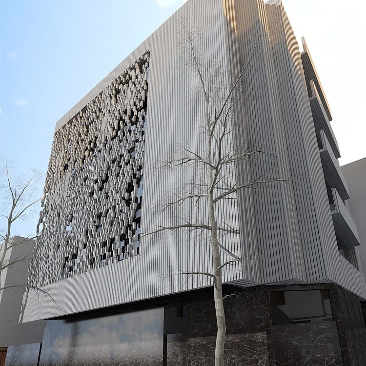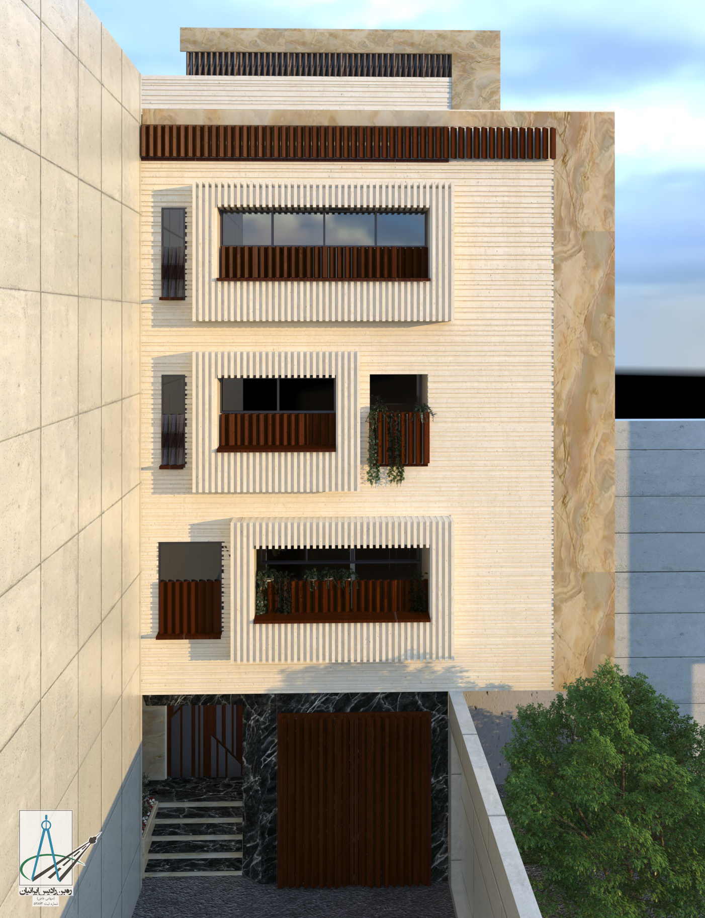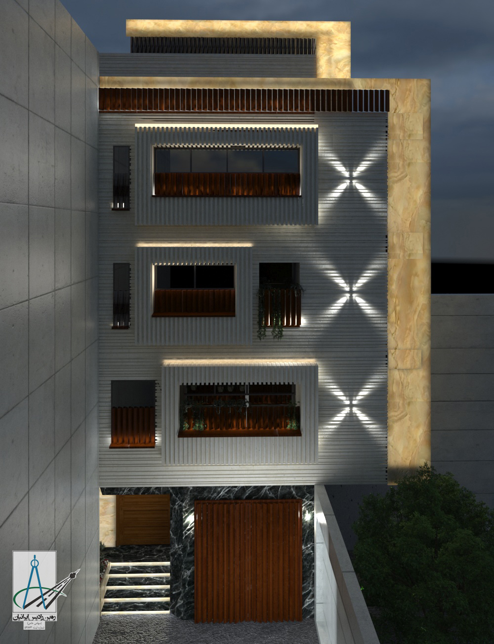 تنشها و تضادهای از شکلها و نیمرخ های پنجره ها شروع شده و میره تا نهایتا به تراسها و کنسول ها ختم بشه. این پروژه شامل شش طبقه با سازه ی بتنی به همراه بام سبز برای تفریح و دورهمی های ساکنین است