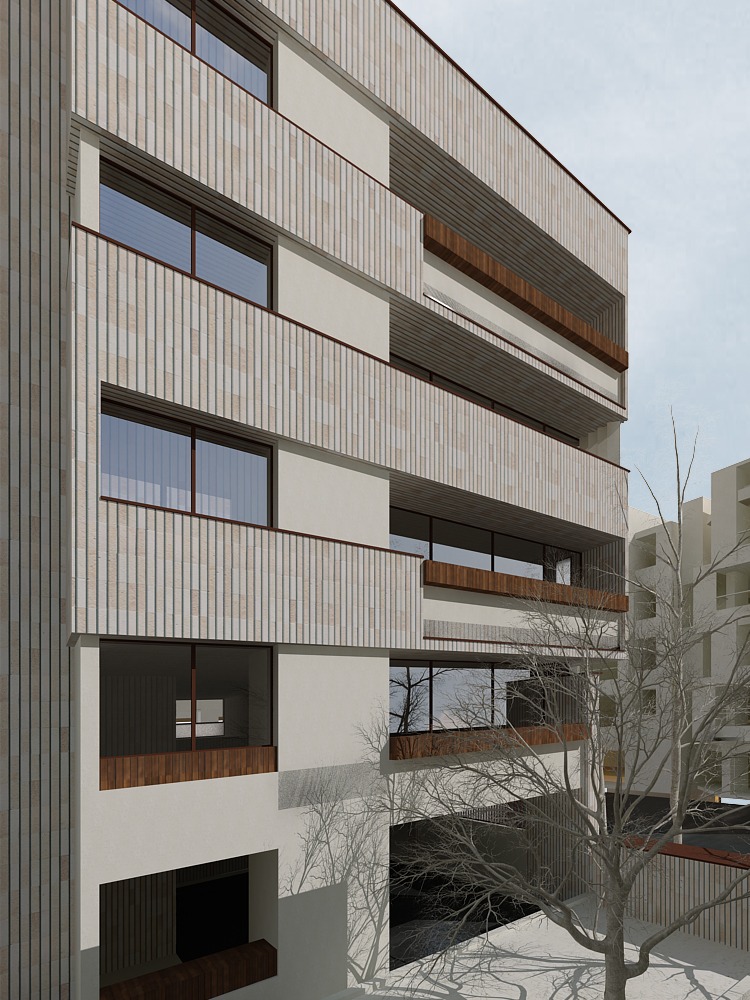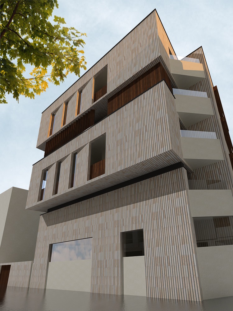 ساختمان چهار طبقه با سازه بتنی. نمای این ساختمان دارای صفحات چوبی با قابلیت جابه جایی برای تغییر نور خورشید در ساعات مختلف روز بنابراین این باعث بهترین نورپردازی طبیعی در طول روز برای فضای داخلی خواهد شد. به علاوه ساکنین می توانند بدون دیده شدن توسط عابرین فضای بیرون را مشاهده کنند و با آن در تعامل باشند. هم چنین این مجتمع دارای سقف سبز جهت گردهمآیی و تفریح ساکنین است. اسلب های سرامیک فورمچ که در طراحی داخلی استفاده شده باعث منحصربه فرد شدن این پروژه گردیده
