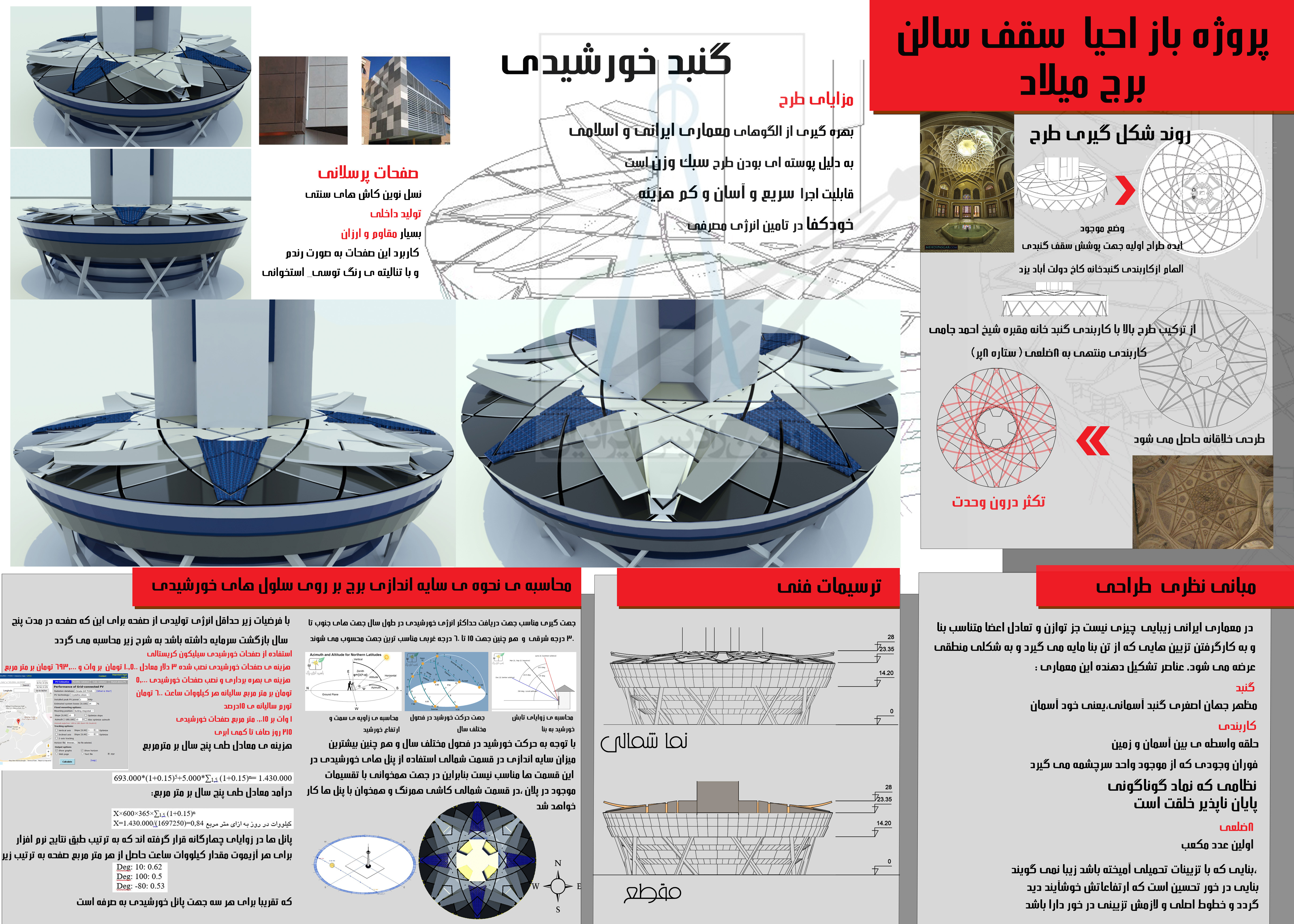 پروژه بازسازی سقف برج میلاد که ما آنرا گنبد خورشیدی مینامیم شامل تکنولوژی های جدید از قبیل باتری های خورشیدی و تایل های پرسلانی است که با زیبایی هر چه تمام با حفظ طرح قبلی و تلفیق طرح جدید و به عنوان یک المان شهری بر روی سقف گنبدی این بنا نقش بسته و هزینه ی بازسازی و تعمیر بعدی آنرا نیز ارزان کرده