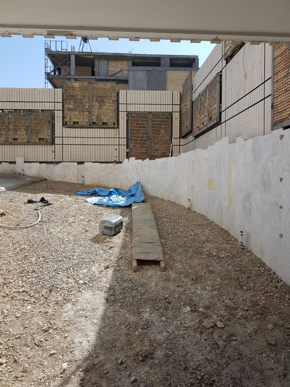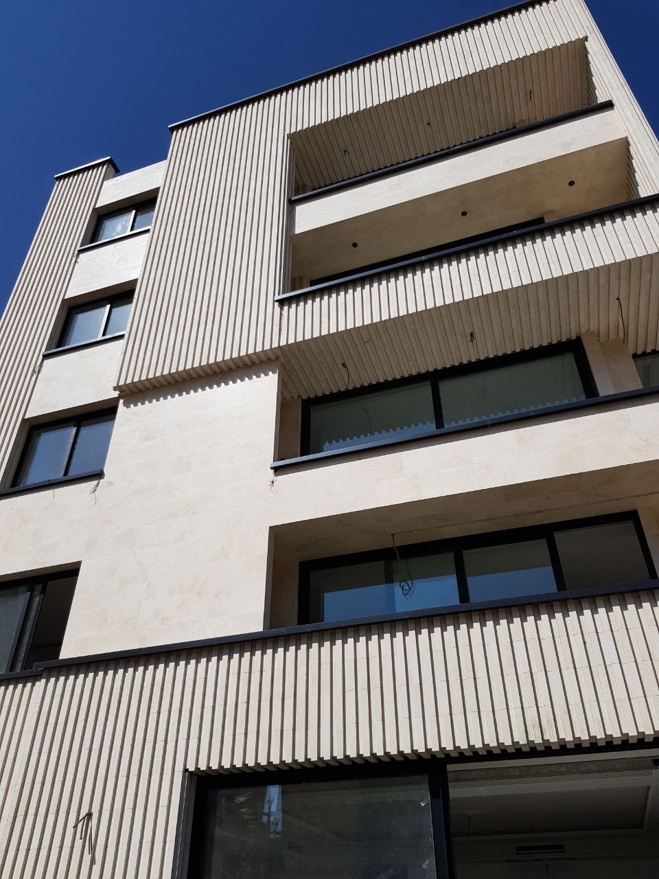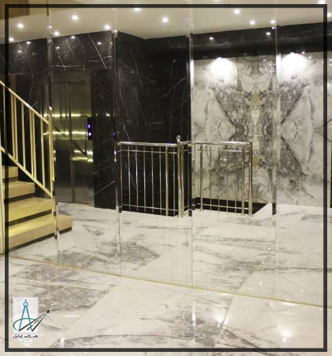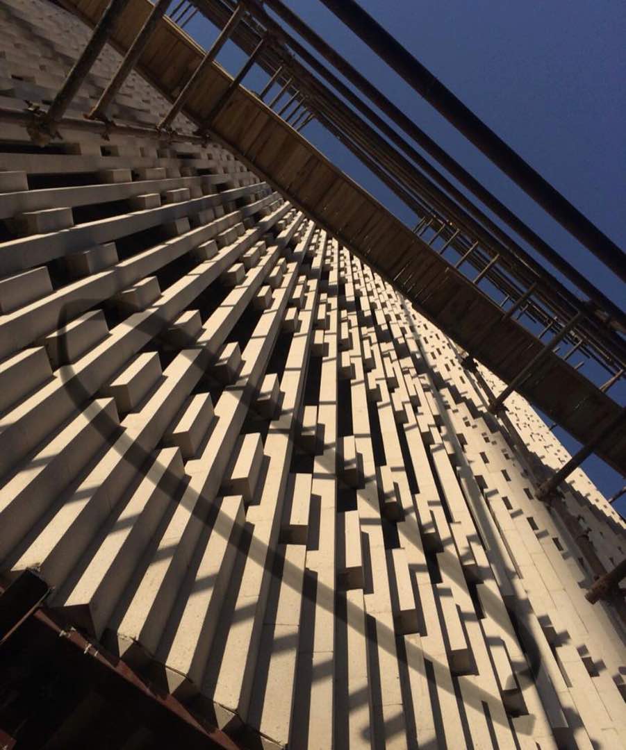 استفاده از چیدمان متفاوت آجرکاری با سازه ی خاص در طراحی این نما باعث ایجاد حس تعلیق و آزادی بیشتر در برقراری ارتباط با فضای محوطه ی بیرون از ساختمان شده. هم چنین استفاده از سنگ ها و اسلب های فور مچ منحصربه فرد در طراحی داخلی این ساختمان پنج طبقه با سازه ی بتنی را زیباتر کرده است