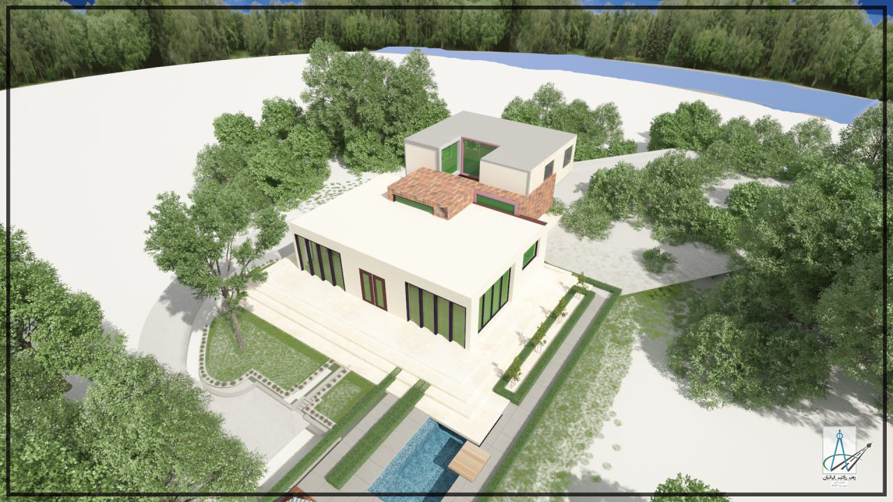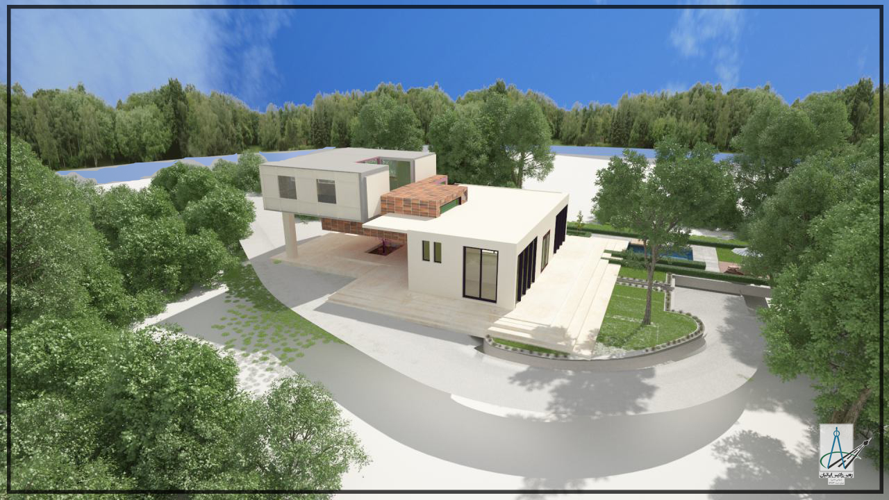 این ویلا متعلق به دو خانواده(دو برادر) بوده، از اینرو کارفرمایان خواهان جدا بودن دو ویلا در عین حال داشتن ارتباط با یکدیگر بودند. به دین منظور ما در نقشه دو مربع (دو ویلا) را در اشتراک با یک مستطیل در سه تراز ارتفاعی متفاوت به یکدیگر ارتباط دادیم. بنابراین هر سه حجم دید و دسترسی عالی به باغ دارند