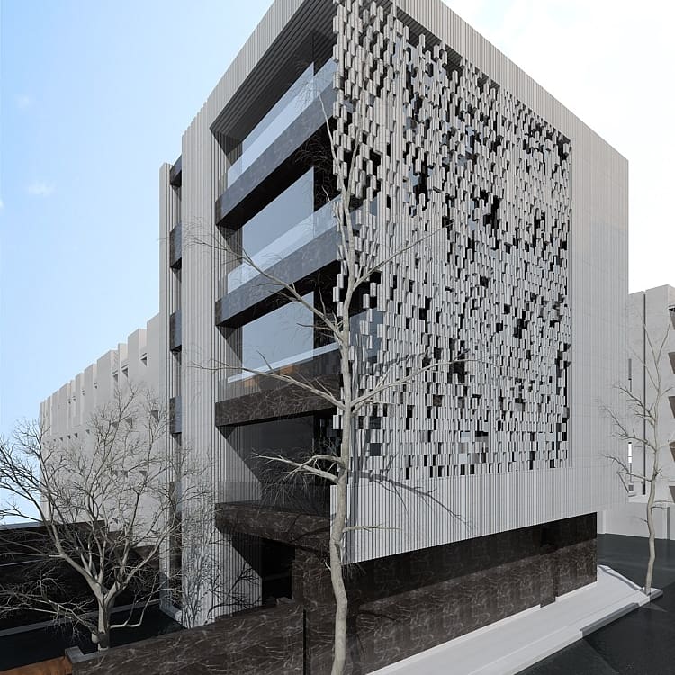استفاده از چیدمان متفاوت آجرکاری با سازه ی خاص در طراحی این نما باعث ایجاد حس تعلیق و آزادی بیشتر در برقراری ارتباط با فضای محوطه ی بیرون از ساختمان شده. هم چنین استفاده از سنگ ها و اسلب های فور مچ منحصربه فرد در طراحی داخلی این ساختمان پنج طبقه با سازه ی بتنی را زیباتر کرده است